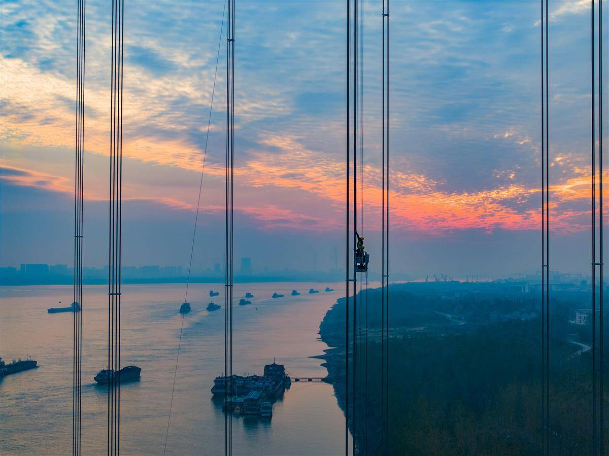 双流长江大桥是一座二维钢箱梁悬索桥,桥塔承载双向八车道高速公路。它是长江上最宽的桥梁。新娘ge 总共由 169 根电缆线组成。一根电缆由127根稀土锌铝合金包覆的高强度钢丝组成,直径为6毫米。钢丝最大抗拉强度达到1960MPa。电缆的最大重量约为 69 吨。图片提供:湖北日报全媒体记者 周立新